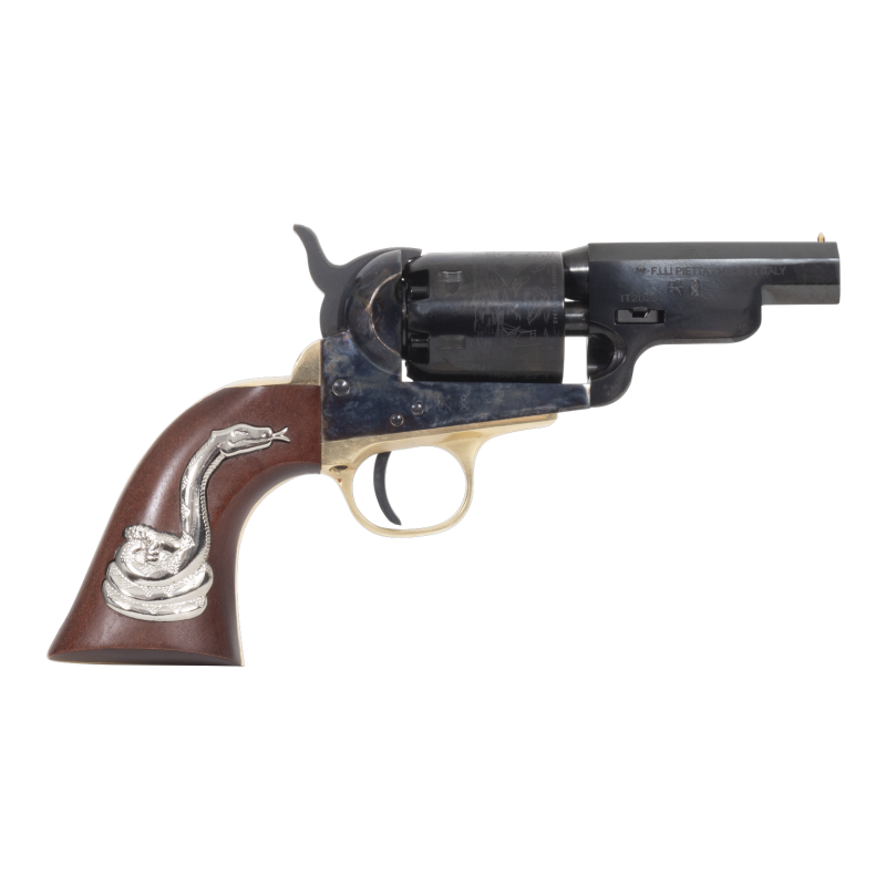 La réplique Pietta 1851 Navy Yank Snubnose en calibre 36 à poudre noire, avec une finition en acier et des gravures "Snake", est une version compacte et artistique du légendaire revolver 1851 Navy.