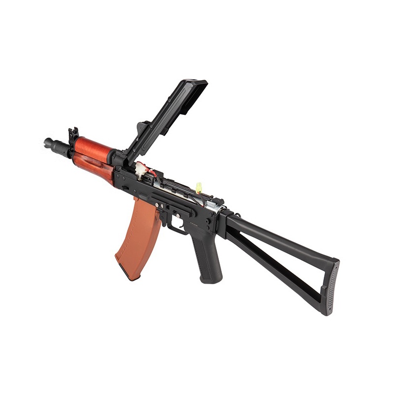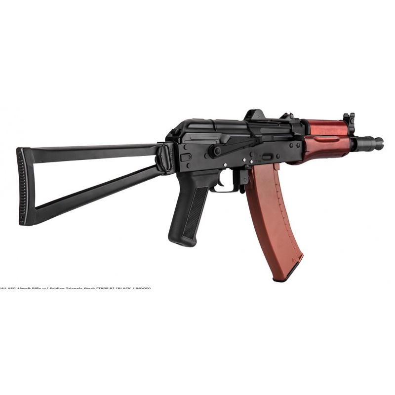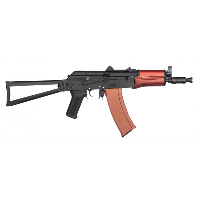 Modèle corps métal de la célèbre AKS74 en version courte, avec sa crosse repliable en métal et son garde-main en bois. Equipé d'origine d'un rail latéral pour le montage d'optique pour AK.