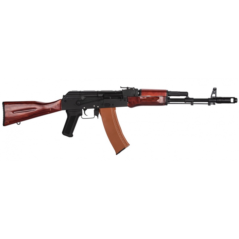 Modèle corps métal de la célèbre AK74 en version longue, avec sa crosse pleine et son garde-main en vrai bois. Equipée d'origine d'un rail latéral pour le montage d'optique pour AK.