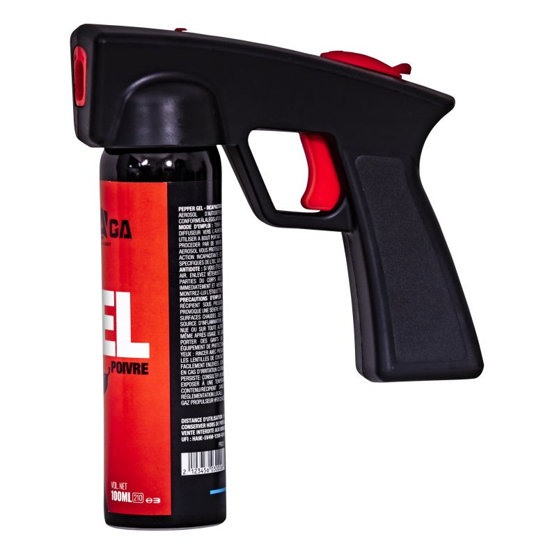 Spray incapacitant Red Pepper défense lacrymogène avec poignée brevetée PRO qui garantie une autonomie 4 à 5 fois supérieure aux poignées standards du marché et une plus longue portée.
